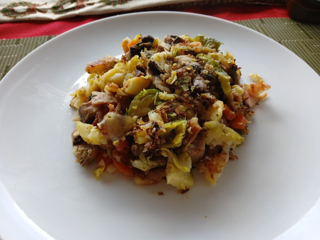 Most leftovers can be ’bubbled’, parsnips, roast potatoes, peas, celeriac, cabbage, sprouts(essential!) carrots, green beans, butter beans and broccoli to name but some. I also chop up pigs in blankets, leftover stuffing and add raw mushrooms for texture, a hearty breakfast before setting out in the snow for a day’s frivolity.